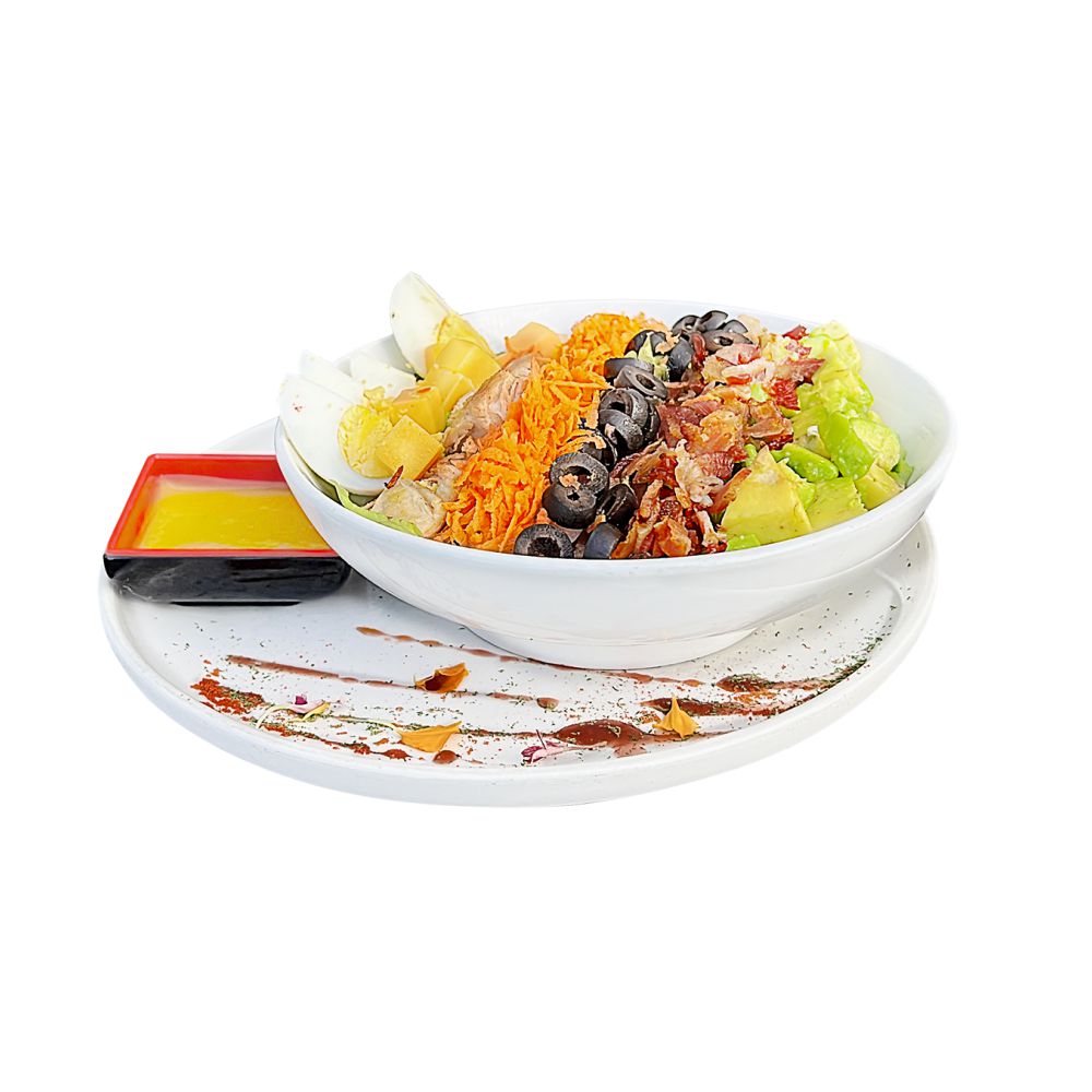 CAMA DE LECHUGA, POLLO, ACEITUNAS NEGRAS, ZANAHORIA, GUESO GOUDA, TOCINETA, AGUACATE, ADEREZO DE MIEL MOSTAZA